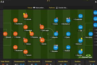 维罗纳对尤文图斯的得分:博里尼8.3分,罗纳尔多8分是全队最高的。。