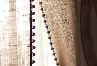 - Cortina de tela de saco con detalle de #madroños en laterales una opción económica al tiempo que artesanal y fresca para el #Verano.