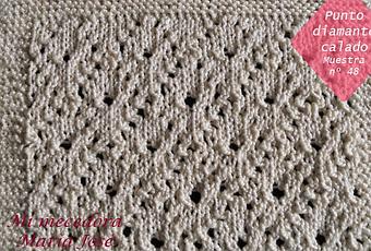 1ª y 9ª vuelta: *1 hebra, 1menguado simple, 1 punto al derecho, 2 puntos juntos al derecho, 1 hebra doble, 1 menguado simple, 1 punto al derecho, 2 puntos juntos al derecho, 1 hebra* (esta hebra y la del comienzo de la vuelta son, en el motivo, unidos en 1 hebra doble)