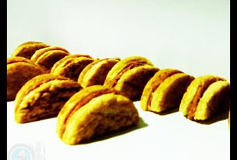 6, Una vez hayamos sacado nuestras pastas del horno, untamos con miel la parte inferior y ponemos sobre ella una media luna de cacahuete y pegamos con otra media luna de pasta previamente untada con miel
