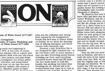 Tras una noche mas que horrible y una mañana incierta,ya me encuentro mucho mejor y pongo otra vez al tajo.Para empezar con energía y por petición popular,os traigo este articulo,de dos paginas y en JPG,que salio en la WD 90 UK(Junio de 1987),donde un relativamente joven Ian Livingstone nos habla de los primeros 10 años de existencia de la White Dwarf como revista oficial de juegos y productos GW por un parte y por otro de sus años como editor de la misma(Sus experiencias,reflexiones,curiosidades,etc...):Esta, lógicamente, en ingles y para verlo mas grande solo tenéis que pinchar en las imágenes con el botón secundario del ratón.Un documento histórico del Hobby muy curioso e interesante que,como otros,nos muestran otros tiempos y otra forma de hacer las cosas en una revista y una empresa que,llevando el mismo nombre que la actual(Ambas),no se parece ya casi en nada.