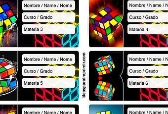 Plantillas con 10 etiquetas de Cubo Rubik para cuadernos, carpetas, libros y manuales escolares para descargar GRATIS en formato PDF. Listas para editar e imprimir en hoja A4.