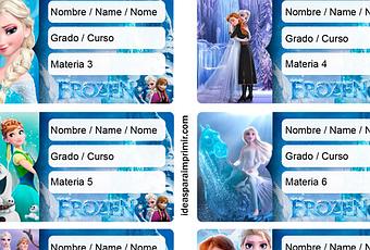 * Las etiquetas escolares editables PDF de Frozen son plantillas de descarga gratuita. Cada plantilla tiene 10 etiquetas, rótulos o pegatinas para cuadernos con un tamaño aproximado de 9 x 5 centímetros cada una.