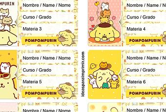Plantillas con 10 etiquetas de Pompompurin para cuadernos, carpetas, libros y manuales escolares para descargar GRATIS en formato PDF. Listas para editar e imprimir en hoja A4.