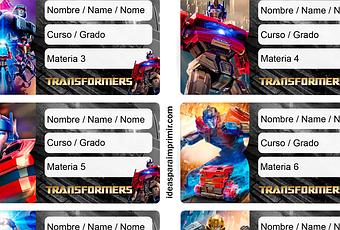 Descargar Etiquetas escolares Transformers One en formato PDF (No Editable). Tamaño de hoja A4.