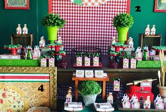 Fuente: @monique_abreu Si quieres el tema para gemelas o hermanas agrega dos figuras y muñecas para la decoración 1 coloca un afiche en el centro al fondo sobre una base en verde 2 enmarca con globos 3 la mesa de dulce puede incluir los recuerdos e instrumentos que se utilizan para realizar la pizza 4 un banderín muy especial con tablas de cortar personalizadas 5 coloca flores en macetas delante de la mesa