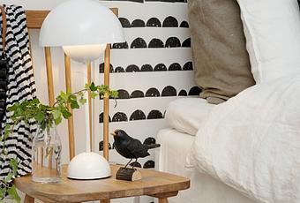 Una pieza clave en el dormitorio es el cabecero. Pero no hace falta que gastes un dineral en comprar uno, lo puedes solucionar con papel pintado. Fíjate en la imagen inferior tan solo tienes que colocar unas tiras de papel pintado con más anchura que la cama y rematar con un junquillo en toda su altura. Fácil y bonito ¿Verdad?