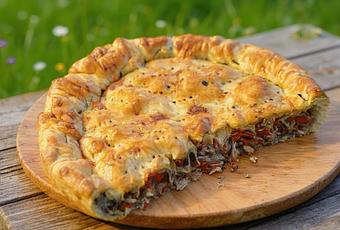- En una bandeja, extiende la mitad de la masa. Coloca el relleno frío, luego distribuye huevos, aceitunas y pasas.