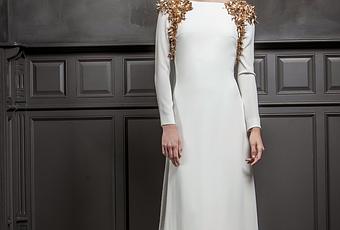 Mangas largas, hombros que cobran protagonismo, cinturas muy marcadas y espaldas descubiertas muy femeninas. Blancos blancos donde no hay opción a color. Cinturones que otorgan majestuosidad. Motivos florales dorados aportando frescura, luz y brillo en hombros, muñecas, cinturas o espaldas. Bordados delicados en espaldas muy sensuales. Caídas de vértigo con telas sutiles que llenan de magia el día de la boda.