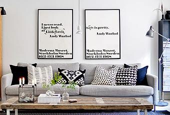 Alfombra de rayas Sillón blanco Silla BlancaCojín Home Sweet Home Cojín rayas banco & negro Alfombra falso pelo gris¿Os gusta la decoración en Blanco y Negro?¿Qué os parece la idea de mezclar sillas diferentes?FELIZ FIN DE SEMANAFuente