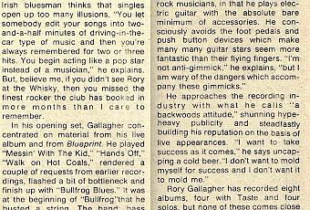 En su set de apertura, Gallagher se concentró en material de su álbum en directo y de Blueprint. Tocó «Messin' With The Kid», «Hands Off», «Walk on Hot Coals», interpretó un par de peticiones de grabaciones anteriores, mostró un poco de bottleneck y terminó con «Bullfrog Blues». Fue al principio de «Bullfrog» cuando rompió una cuerda. La banda: el bajista Gerry McAvoy, el batería Rod De'Ath y el pianista Lou Martin procedieron a adornar la introducción, mientras Rory volvía a encordar y afinar rápidamente su instrumento. Parecía fácil. El estilo de Gallagher es el del blues de chico duro. Es rápido, pero no exagerado. Su presencia es magnética y su actuación avergüenza a muchos de los contemporáneos que le superan comercialmente.