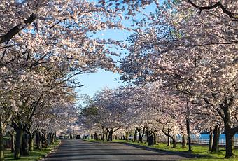 Mientras todos pelean por el estacionamiento en Tidal Basin, los lugareños recorren este circuito de 3 millas alrededor del East Potomac Park, donde florecen los cerezos sin el caos de los autobuses turísticos. Obtendrá el mismo efecto de túnel rosa y blanco sobre la carretera, además de vistas adicionales del Monumento a Washington reflejado en el río Potomac.