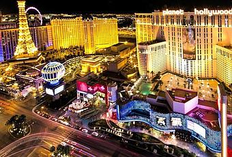 La sección central de 2,5 millas de largo del bulevar de Las Vegas atraviesa la ciudad de noreste a suroeste. Esta es conocida como The Strip o La Franja y está llena de grandes hoteles y lugares de entretenimiento. Muchos han sido construidos con un tema definido y son el hogar de habitaciones de lujo y restaurantes. La franja es particularmente impresionante por la noche, cuando la ciudad es iluminada por una interminable sucesión de brillantes letreros de neón.