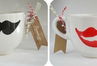 Una preciosa taza pintada por ella misma, en la que por una parte tenemos el típico moustache tan de moda últimamente, y por la otra unos labios rojo la mar de sexys jejeje