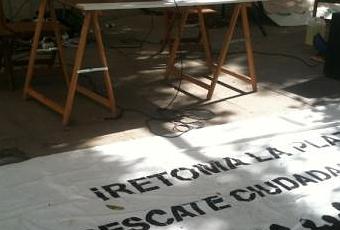 Con un equipo de megafonía básico y prestado, la gente se agolpaba sentada en el suelo ante la mesa precaria y sin adornos, presidida por una de las pancartas que se pasearon durante la manifestación del sábado, desde donde los ponentes lanzaban sus propuestas. Un miembro del 15M retransmitía el evento por streaming con una pequeña cámara de vídeo y una chica asperjaba agua sobre la gente con un pequeño pulverizador de plástico.