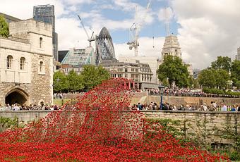En esta visita, en 2014, los exteriores de la Torre de Londres tenían un aspecto muy especial. El país rendía homenaje a sus soldados caídos con motivo del centenario de la I Guerra Mundial, la fecha concreta era el 5 de agosto, primer día en que Gran Bretaña participó en el conflicto bélico. Para ello, siguiendo el proyecto de Tom Piper, se habían ido colocando poco a poco unas amapolas rojas de cerámica en los alrededores de la Torre de Londres, tras los muros defensivos. Exactamente, 888.246 amapolas, las mismas que caídos. Ello simulaba un mar de sangre a través de las flores. La última amapola se colocó en noviembre. Cada una de estas amapolas se vendió por internet y parte de los ingresos obtenidos fueron donados.