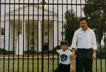 Narcotraficante Pablo Escobar y su hijo delante de la casa blanca. Washington, 1980, mientras la DEA y la Interpol lo buscaban por cielo y tierra
