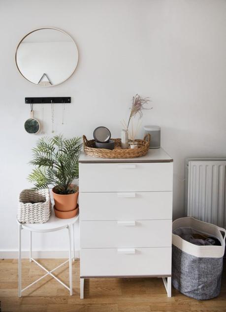 Intentaré ir poniendo enlaces de todos los productos que voy localizando y verás que por muy poquito podrías montarte una habitación monérrima. Han utilizado dos taburetes Frosta, Dos lámparas para la mesa de noche muy nórdicas, Cabecero Malm, Dos estantes Mosslanda para llenarlo de marcos con láminas para decorar, Una cómoda Trysyl, Una mesita Gladom en blanco para poner plantas y alguna cestita de almacenaje pequeño, cesto para la ropa sucia, espejo redondo, floreros pequeñitos para decorar, luces led para decorar el cabecero de la cama, dos estores skogsklover en gris y por último un reloj snajdare.