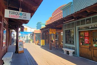 Las aceras cubiertas bordean los edificios de temática del Oeste y las interesantes tiendas que venden todo tipo de artículos, desde mantas, ropa y baratijas mexicanas hasta arte, artesanías y joyas de los nativos americanos. Además, las galerías de lujo exhiben las obras de artistas de fama mundial.