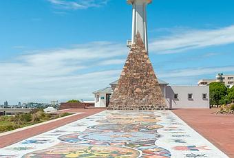Los mosaicos de colores brillantes que representan parte de los barcos portugueses que navegaron por primera vez alrededor de esta parte de la costa sudafricana, y los recortes de metal de Nelson Mandela con el puño levantado en señal de celebración, traen la Reserva Donkin a la era moderna.