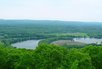 Imposible de ignorar en el lado este de la ciudad se encuentra el pico traprock más alto de Metacomet Ridge. El Monte Tom, que se eleva a 1202 pies, es parte de una cadena de picos de 100 millas que se extiende desde el extremo norte del condado de Franklin hasta Long Island Sound en el sur.
