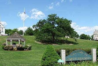 El núcleo de North Reading’s se puede encontrar en Town Common, en una parcela triangular e inclinada hacia el sur desde la Tercera Casa de Reuniones (1829), construida en estilo neogriego.
