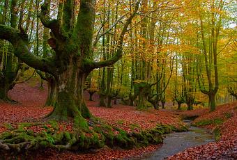 Los hayas de este bosque del País Vasco crecen en formas retorcidas y nudosas que parecen deliberadamente torturadas. Sus troncos se curvan y giran en espiral como si estuvieran tratando desesperadamente de escapar del suelo. Los árboles fueron podados intensamente hace siglos para producir carbón, lo que los obligó a crecer en estas extrañas formas retorcidas.