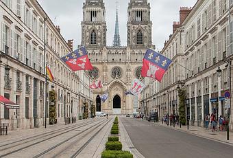 Antes de darnos cuenta, salimos a la calle que nos muestra la imagen más bonita, para nuestro gusto, de Orleans. Probablemente, también de las más populares. Desde la calle de Juana de Arco, se ve al fondo la fachada de la Catedral de Orleans. En nuestra visita, la calle estaba decorada con unas banderas.