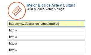 Si habéis llegado hasta aquí, ya habéis hecho lo más difícil. Ahora sólo falta votar. El blog de "Descartes no fue al cine" está en la sección de "Mejor Blog de Arte y Cultura". En ese apartado a continuación del http:// podéis poner www.descartesnofuealcine.es , tal y como os pongo en la foto de aquí abajo.