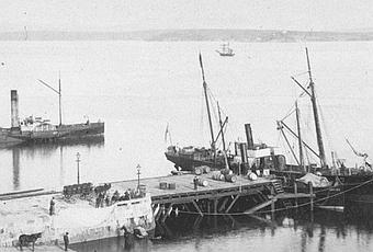 1875 embarcadero de la Ribera: a la izquierda el remolcador de vapor Hércules propiedad de los Dóriga y que en 1882 seria comprado por la empresa La Corconera y convertido en Corconera nº 6