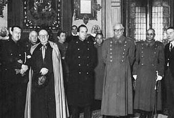 El Sr. obispo de Santander, D. José Eguino y Trecu,con dulleta y manteo, el alcalde de Santander y el Gobernador Civil durante una recepción al General Yagüe
