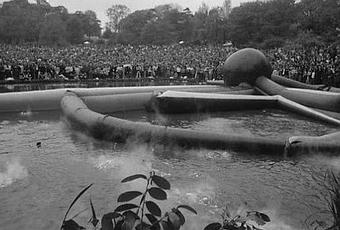 En la laguna había peces que, con el pulpo y su aire comprimido, las bengalas que se lanzaron, los petas y colillas y la muchedumbre, empezaron a aparecer en la superficie boca arriba (se dice que el potentísimo sistema cuadrafónico también contribuyó a la ‘masacre’). Así, de repente, el estanque estaba lleno de gente medio enloquecida, una estructura de plástico gigantesca flotando y miles de peces flotando entre todo. Para completar el cuadro, empezó a llover torrencialmente; unos salieron del lago y buscaron refugio, pero la mayoría pensó que ya estaba suficientemente mojada como para salir del agua, y allí siguieron mientras más y más peces muertos iban apareciendo en la superficie.