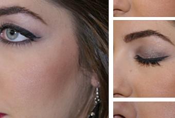 Para los ojos he usado un tono gris mate de sombra, aplicándola en el parpado móvil y difuminando bien hacia el parpado superior, y aplicando también en la línea inferior de pestañas, a ras. En la zona de la difuminación he metido un tono rosa claro mate, para darle un poco de vida al ojo y no se quedase muy apagado solo con el gris. Encima del gris, he utilizado una sombra beige irisada, que es la que le ha dado el brillo al ojo. Para darle fuerza a la línea de pestañas superior, he usado un eyeliner negro, ancho en el extremo, para que "tire" bien del ojo, y abra la mirada. Después mascara de pestañas negra y lápiz negro en la línea de agua.