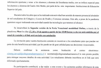 "Estimados(as) les saludo atentamente desde El Colegio Amalia Errázuriz de la ciudad de Ovalle y les invito gratamente a hacer partícipes de este evento a sus alumnos (as) de Enseñanza Media de la segunda versión de la Feria Vocacional on line que organiza el Colegio en su labor de Extensión para que Liceos y Colegios tengan la oportunidad de informarse con las mas prestigiosas Instituciones de Educación Superior y Fuerzas Armadas del país.