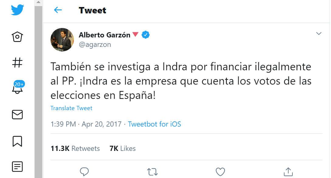 Lo publicó EN SU TWITTER el ahora Ministro de Consumo Alberto Garzón cuando no era nada más que un aspirante, a saber si no le dieron un ministerio para que NO HABLARA DEL FRAUDE ELECTORAL de Indra. Lo bueno es que se ha olvidado de borrarlo, por la boca muere el pez. En román paladino, Una empresa especializada en fraude electoral. Y QUE TIENE VARIAS DENUNCIAS EN VARIOS PAÍSES DEL MUNDO EN LOS QUE HA TRABAJADO CON LOS GOBIERNOS corruptos Es la que nos cuenta los votos desde hace más de 20 años. Y este fraude histórico de las elecciones españolas se realiza con la complicidad de TODOS LOS PARTIDOS POLÍTICOS. ¿pero cómo van a hacer eso? Pues así es, y lo reconoce la propia Junta electoral provincial de Sevilla es su auto del 2015 donde afirma sin empacho que sólo se hace un “procedimiento abreviado”, lo que es equivalente a un paripé, puesto que el escrutinio general sólo se puede hacer mediante la apertura sucesiva de los sobres y la suma consecutiva de todas las actas de todas las mesas electorales de toda la provincia.