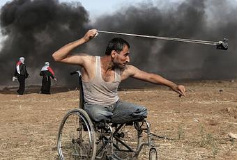 Saber al-Ashkar, de 29 años, lanza rocas durante los enfrentamientos con las fuerzas israelíes a lo largo de la frontera con la franja de Gaza, el 11 de mayo de 2018. Más de cincuenta palestinos murieron a causa del fuego israelí desde que comenzaron las protestas y los enfrentamientos el 30 de marzo, con la intención de que refugiados palestinos pudieran ocupar nuevamente el territorio que hoy es Israel. Debido a la imposibilidad de obtener una derivación médica para ser operados fuera de la Franja, muchos palestinos sufren amputaciones de miembros. Desde diciembre de 2017, el funesto balance apunta a 142 fallecidos y 19.000 heridos, según el Ministerio de Salud palestino.