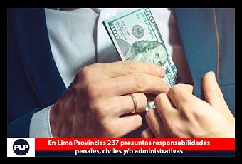 Asimismo, se identificó en Lima Provincias 237 presuntas responsabilidades penales, civiles y/o administrativas, que corresponden a 157 funcionarios o servidores públicos. Cabe precisar que un funcionario o servidor podría estar identificado por un mismo hecho irregular en más de una responsabilidad.