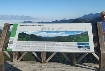 Después de descansar bien en el hotel Peñalabra, tras un desayuno bastante completo, emprendimos la ruta que, por la carretera autonómica CL-627, se dirige hacia el norte, bordeando el embalse de Requejada, hasta llegar a puerto de Piedrasluengas, en el límite de Cantabria, y en el mirador de dicho puerto nos detuvimos y nos maravillamos de la preciosa vista de los Picos de Europa en lontananza, coronado por una franja de niebla al estilo de un mar de nubes. Visión recomendable y que justifica de sobre las muchas curvas de la carretera.