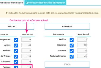 El sistema que numera automáticamente los documentos (Facturas, Presupuestos, etc) funciona mediante un contador que va asociado a la serie. Esto quiere decir que cada serie y cada documento (Factura, Presupuestos, etc) tiene su propio contador y numeración.