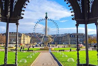 La zona que rodea la Schlossplatz está repleta de restaurantes, tiendas y museos, lo que la convierte en un lugar agradable para pasear sin un destino en particular en mente. Pase por el Neues Schloss hacia el noreste para encontrar el amplio Oberer Schloßgarten con un gran estanque y árboles imponentes. También encontrará el Staatstheater , que data de principios del siglo XX .