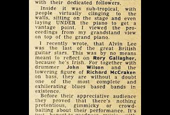 Esto no pretendía en absoluto reflejarse en Rory Gallagher, porque es irlandés. Pues junto con el batería John Wilson y la imponente figura de Richard McCraken al bajo, son sin duda alguna la banda de blues más completa y estimulante que existe.