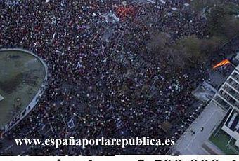 El sábado se llevó a cabo la mayor manifestación de la historia de España, según los organizadores más de dos millones y medio de personas, según la prensa extranjera entre un millón y millón y medio de personas, manifestándose pacíficamente contra los criminales recortes del corrupto Reino de España, según los manifestantes dos millones y medio, según la policía 36.000 individuos, según El País 50.000 personas, según el ABC y la Razón unos 1500 radicales violentos.