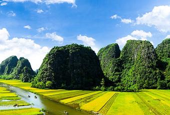 Tam Coc es conocido por su paisaje kárstico, que es similar a la bahía de Halong más conocida, aunque aquí encontrará algunas pintorescas colinas de piedra caliza que están salpicadas entre arrozales de color verde esmeralda.