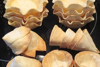 Se pueden comprar, sí, claro, pero aquí se trata de hacer nosotros mismos el apaño, por ejemplo, con masa en los moldes de magdalenas o con las obleas de empanadillas, recortando la masa de hojaldre o con pasta filo... Me ha fascinado la siguiente manera de transformar las obleas en tartaletas y cucuruchos de diferentes formas y tamaños para variar las presentaciones.