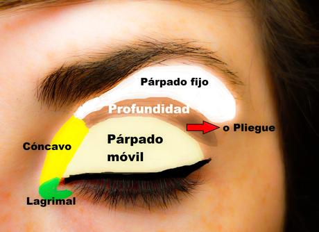 El parpado superior se divide en tres: la base ( desde las pestañas hasta la cuenca del ojo), el pliegue hundido ( parpado móvil) y el puente ( bordea la cuenca del ojo hasta la ceja).