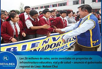 Recursos adicionales son fruto de gestiones ante el Ejecutivo salienteProyectos de infraestructura educativa, vial y de salud – pondrá en marcha el Gobierno Regional de Lima (GORE LIMA) – gracias a los bonos soberanos por cerca de 26 millones de soles. El anuncio lo hizo el titular del pliego Nelson Chui Mejía.