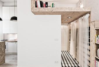 Este pequeño apartamento de 29m2 y de 3,7 m de altura ha sido diseñado por el estudio 3XA. En él han creado dos alturas, en la parte de abajo salón, comedor y cocina en un mismo espacio y sobre el baño y el pasillo está el dormitorio. La escalera de conglomerado de madera está aprovechada formando una libreria. Y para engañar a la vista han puesto en el salón una puerta ciega, un buen truco para hacernos creer que hay otra habitación!