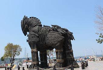 Tras la comida iniciamos la visita. En la entrada a la ciudad hay una explanada en la que se exhibe otro caballo, diferente y más grande que el anterior, y en el que es posible entrar y subir hasta arriba para experimentar, cómo no, lo que sintieron los legendarios guerreros dirigidos por Ulises durante el ataque.