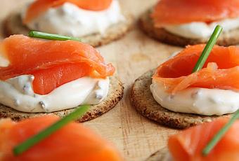 Mezclamos una pizca de eneldo con el queso de untar. Untamos con queso el pan que hayamos elegido y ponemos encima un poco del salmón ahumado.