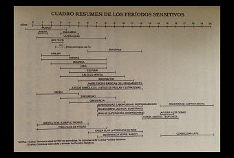 Este cuadro resumen de los períodos sensitivos muestra a qué edad nuestros hijos están naturalmente listos para aprender o para comenzar a aprender ciertos hábitos y habilidades, en el área afectiva, física, espiritual, intelectual y de la voluntad. Conociendo esto, es más fácil saber qué aspectos debemos potenciar más con actividades concretas y con nuestro ejemplo, dependiendo de la edad de nuestros hijos. Así orientamos nuestra energía a aspectos específicos.